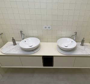 Utilizamos pedra natural - mármore e granito; pedra ultra compacta; quartzos e ladrilho.